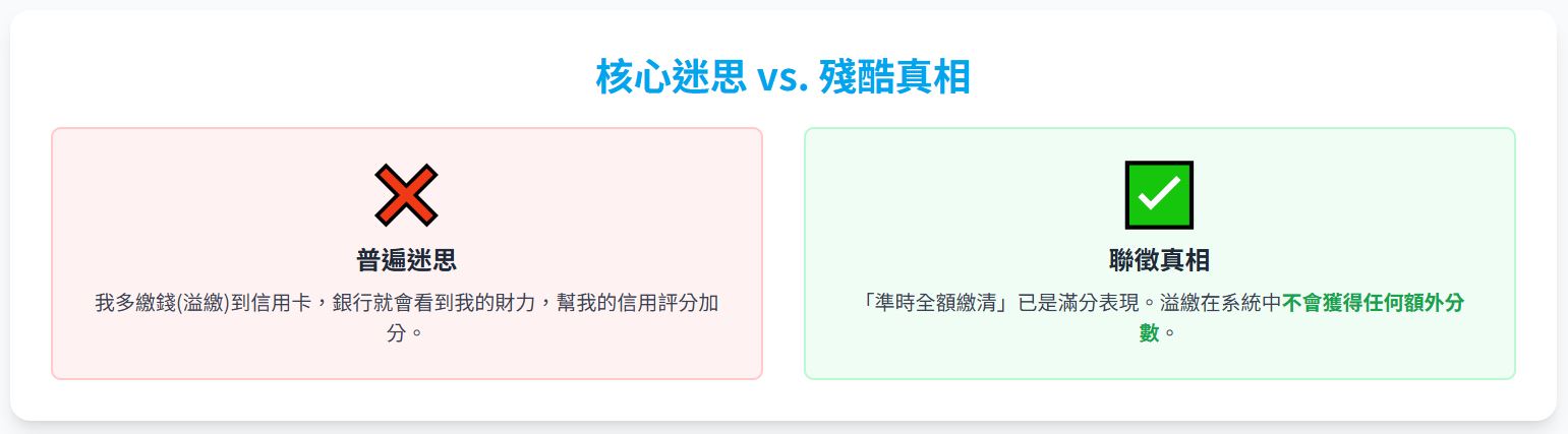 總結來說,聯徵的評分邏輯是「防守」而非「進攻」。它獎勵的是長期穩定、可預測的良好行為,而不是一次性的超額表現。你的溢繳,就像一個從不遲到的員工,某天提早了三小時到公司,老闆或許會口頭嘉許,但這並不會改變你「全勤」的本質評價。