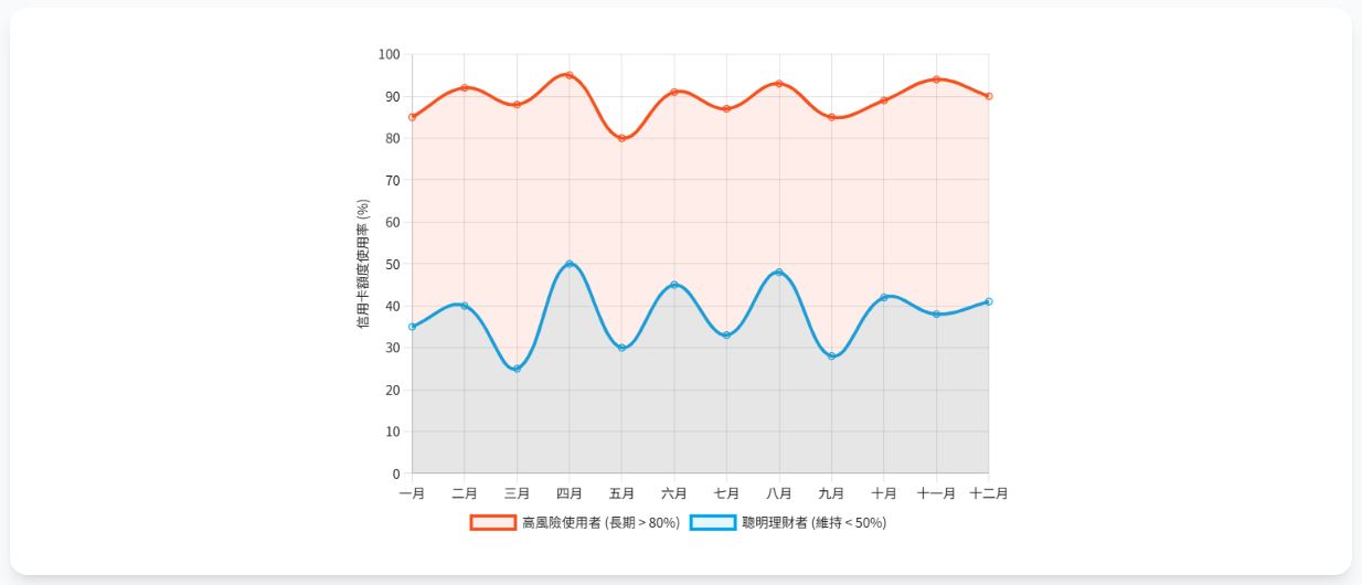 - 為什麼重要: 一個長期將信用卡刷到接近額度上限的人,在銀行眼中,意味著他對信貸的依賴度極高,生活處於一種「財務鋼索」的狀態,風險極高。反之,一個額度10萬,但每月平均只刷3-5萬的人,代表他有足夠的財務緩衝,還款能力穩定。