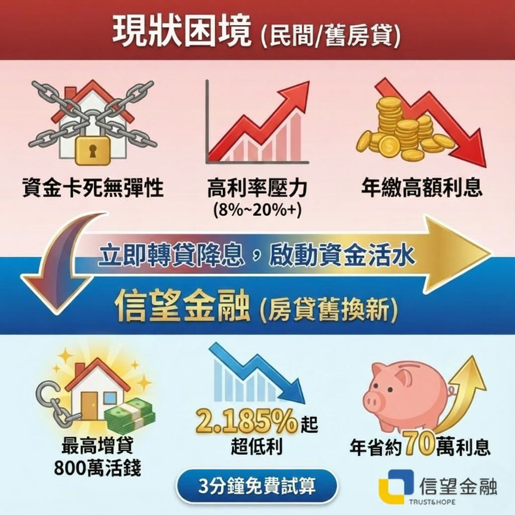 聰明的屋主懂得適時調整資產配置。 別讓舊房貸限制了您的發展機會! 透過專業規劃,把不合理的利息支出,變成您手中的百萬投資/週轉金。