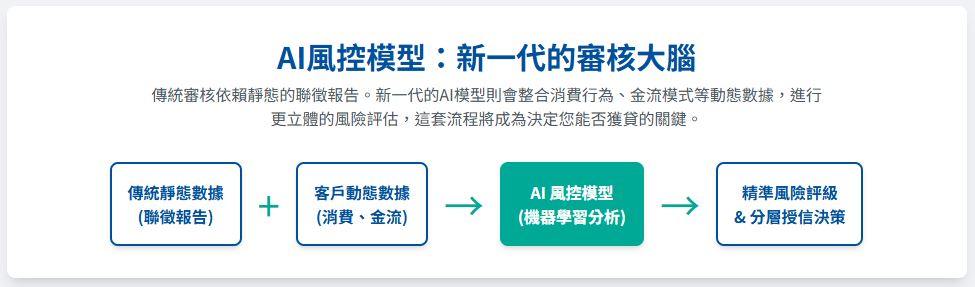 | 客戶評估模型 | 主要依賴靜態的聯徵報告與收入證明,評估標準單一。 | 採用 AI 與大數據模型,整合金融行為、消費習慣、數位足跡等多維度資料。 |
