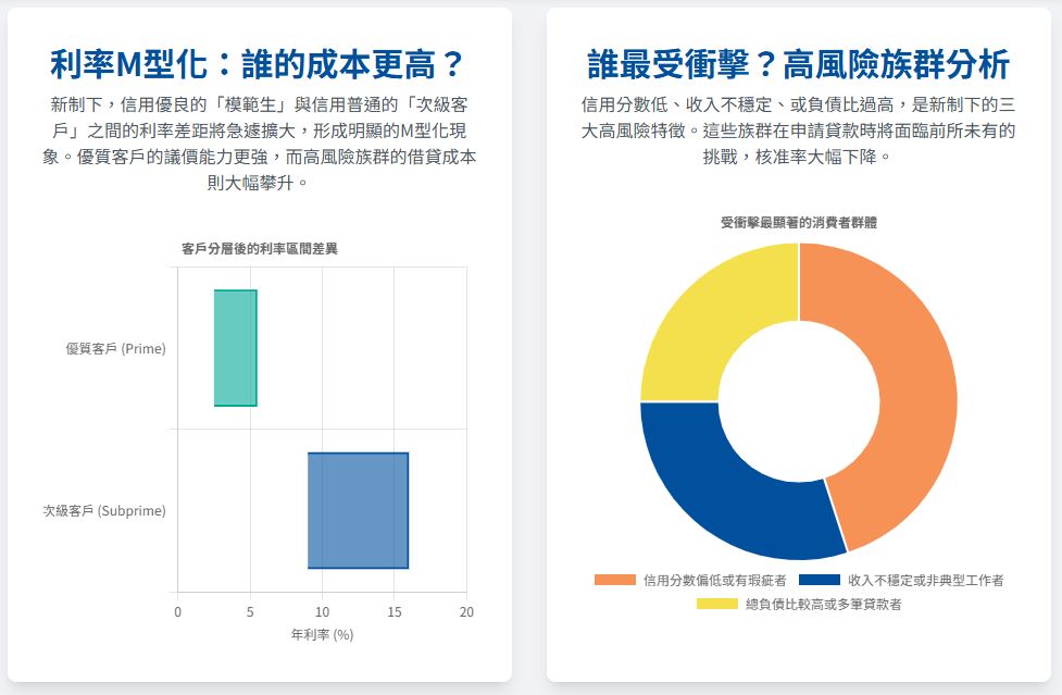 在銀行策略全面轉向「風險控管」的新時代,最直接的衝擊將反映在信貸核准率的普遍下降,以及不同信用條件借款人之間利率條件的急遽分化。過去那種只要敢申請、多半能成功的時代將不復存在。市場將會進行一次殘酷但真實的篩選,一部分人會發現貸款變得前所未有的困難,而另一部分人則可能享受到更勝以往的尊榮服務。