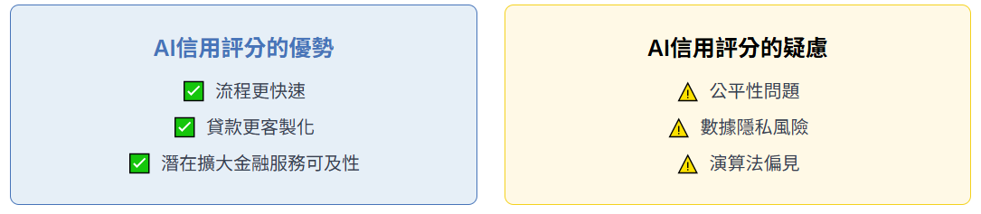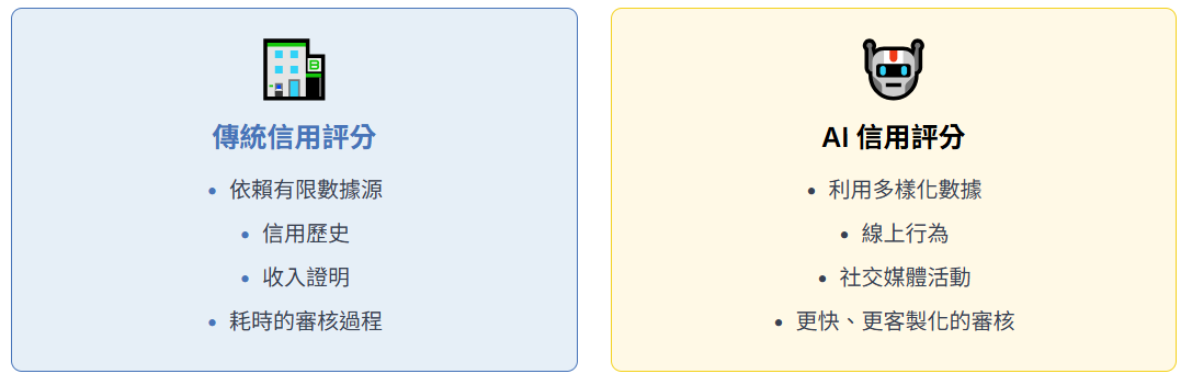 AI 信用評分則加入了「行為數據」與「非傳統資料」